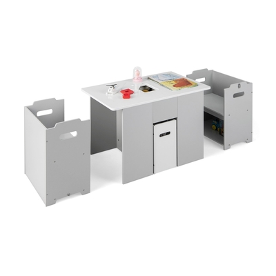 Give kids a playing area for unlimited fun with this 4-in-1 children's table & chairs set! Generally, the table & 2 chairs are used together as a set. However, you can use the 2 chairs individually since they can be stacked & converted into a 4-tier storage cabinet. What's more, you are capable of removing the lid on the tabletop & pulling out the storage bin under the table to enrich storage areas. The safe & rounded corners protect children's delicate skin. The versatile design satisfies toddlers' needs for playing, drawing, learning, eating, etc. When your kids do not need to use the chairs, you can push them under the desk to save space. & the cut-out handles offer great convenience for moving. 4-in-1 Design & Multiple Storage: Usually, it serves as a kid's table & chair set. You can stack 2 chairs together with metal buckles to get a 4-tier storage cabinet. Likewise, extra storage space represents once you remove the lid from the tabletop. & the storage bin under...